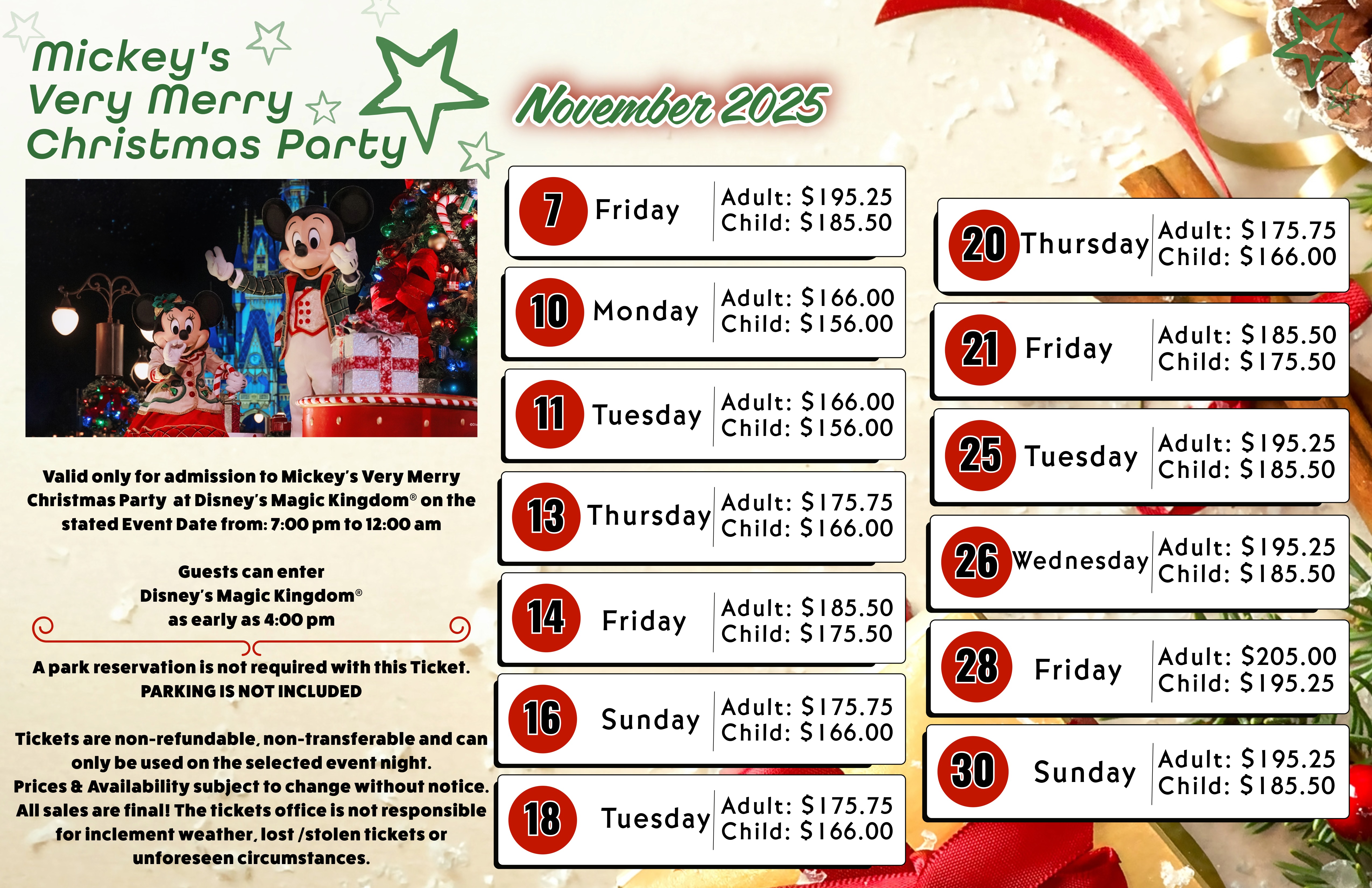 See Mickey's Very Merry Christmas Party Pricing for event dates and prices.