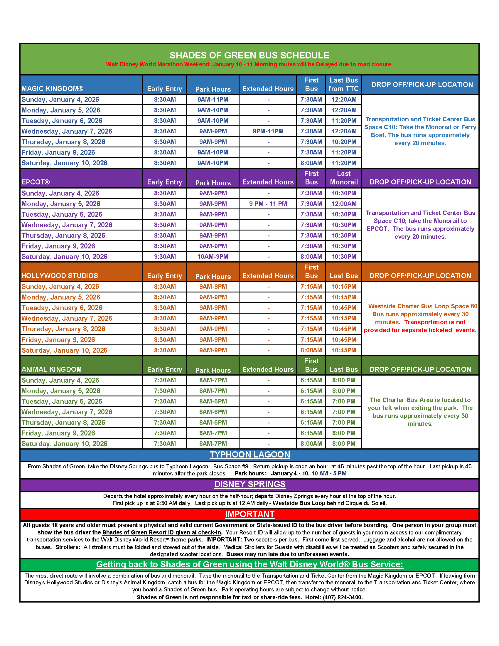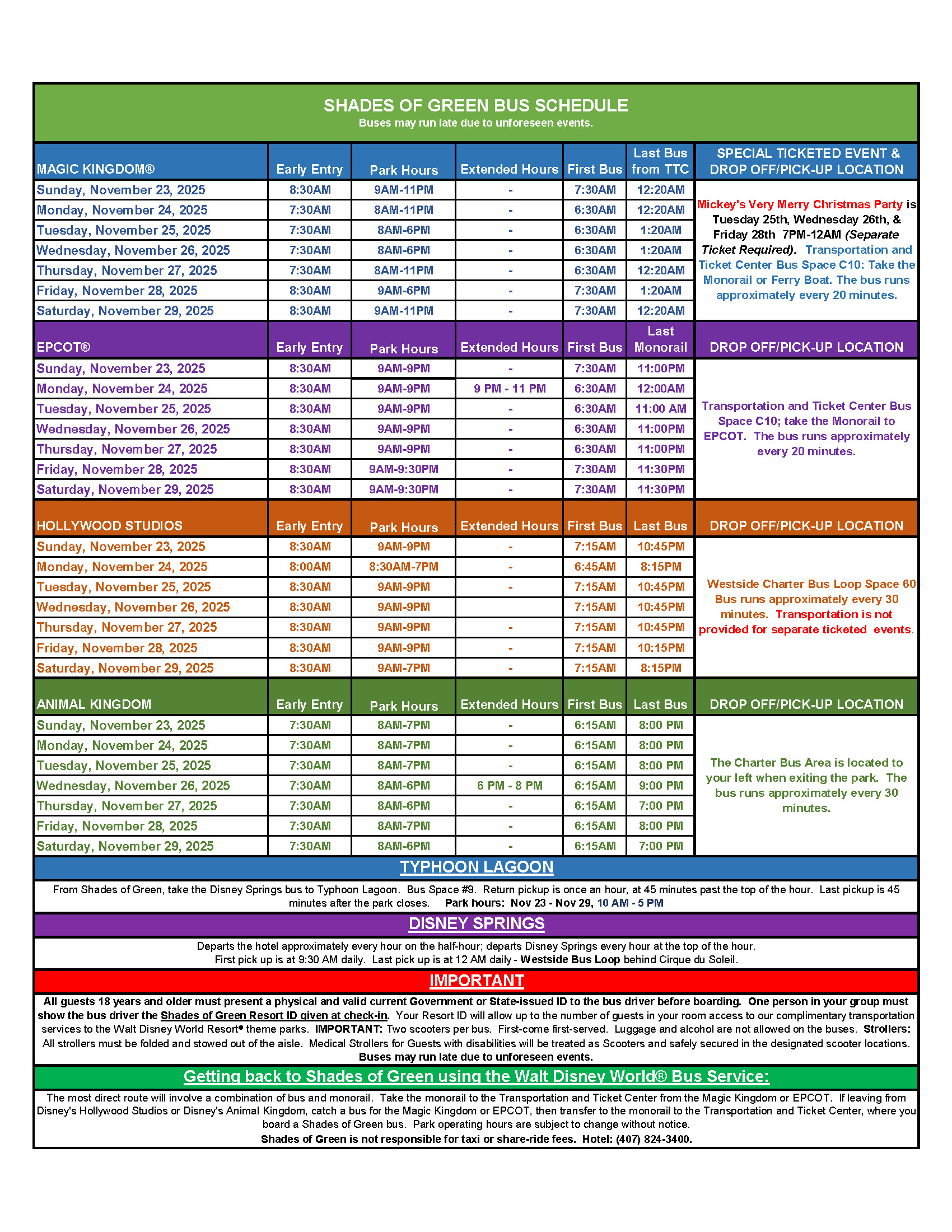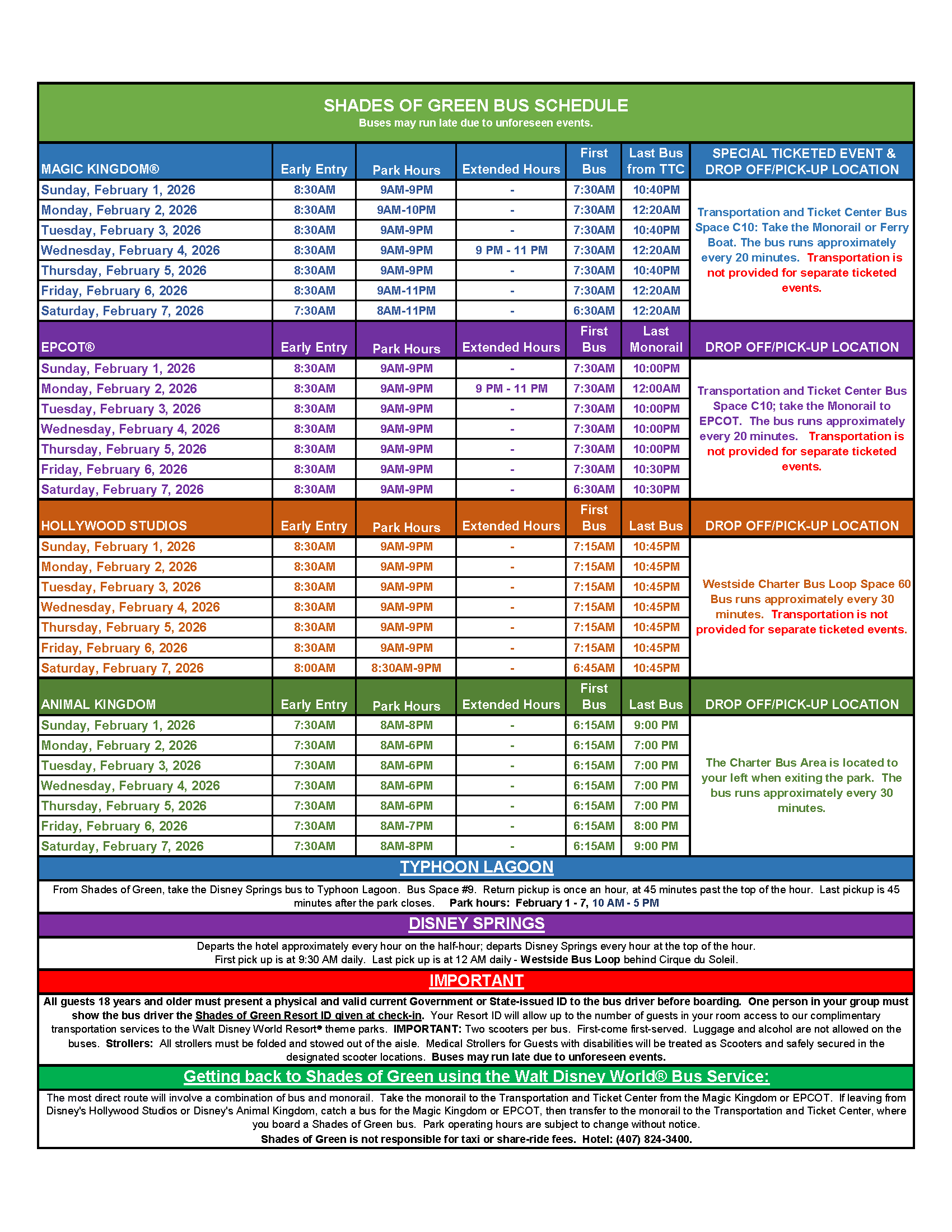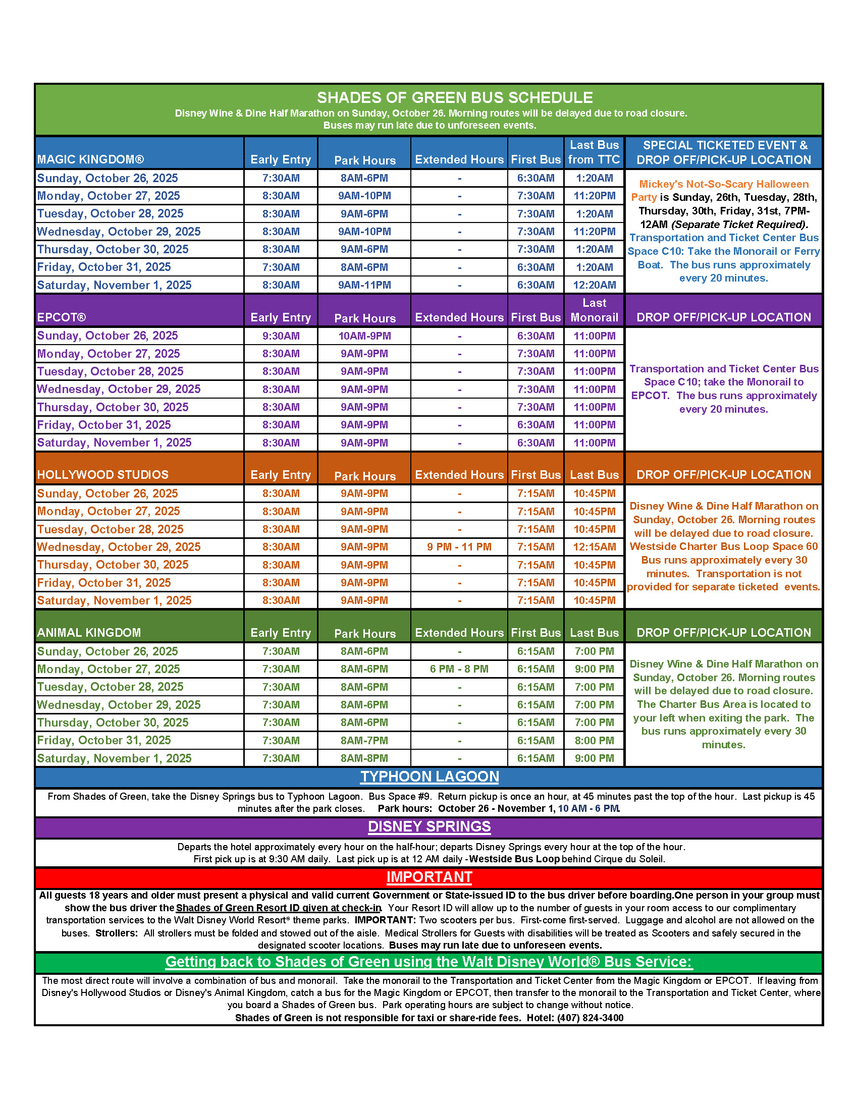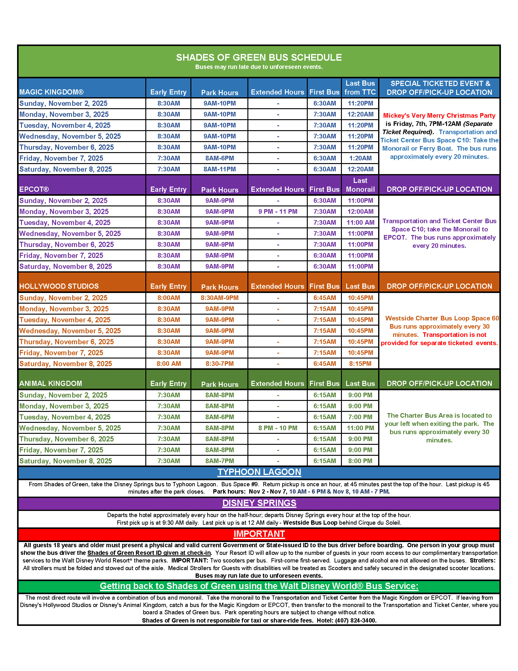 Due to the limited number of passengers (30-33 max) allowed you may be required to wait for the next bus. We understand the difficulty of waiting for transportation to and from the parks and we apologize for any inconvenience this may cause. While on the bus we ask that your party sit together, be courteous to your fellow passengers and follow the safety guidelines outlined on the back. No eating or drinking while on the bus. Shades of Green is not responsible for taxi or share ride fees if you choose not to wait for one of our buses.