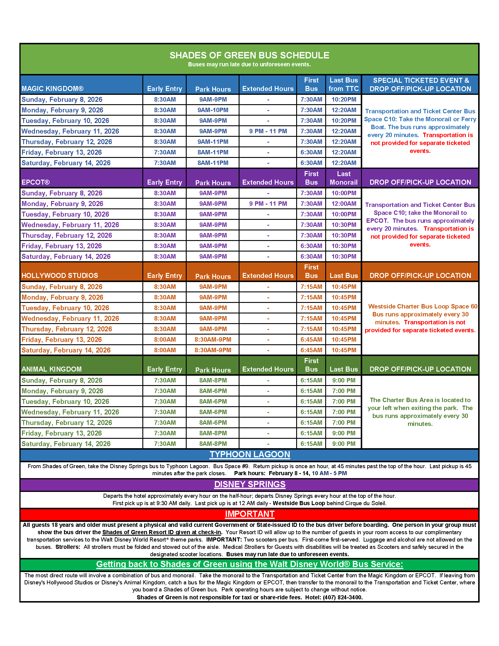 Due to the limited number of passengers (30-33 max) allowed you may be required to wait for the next bus. We understand the difficulty of waiting for transportation to and from the parks and we apologize for any inconvenience this may cause. While on the bus we ask that your party sit together, be courteous to your fellow passengers and follow the safety guidelines outlined on the back. No eating or drinking while on the bus. Shades of Green is not responsible for taxi or share ride fees if you choose not to wait for one of our buses.