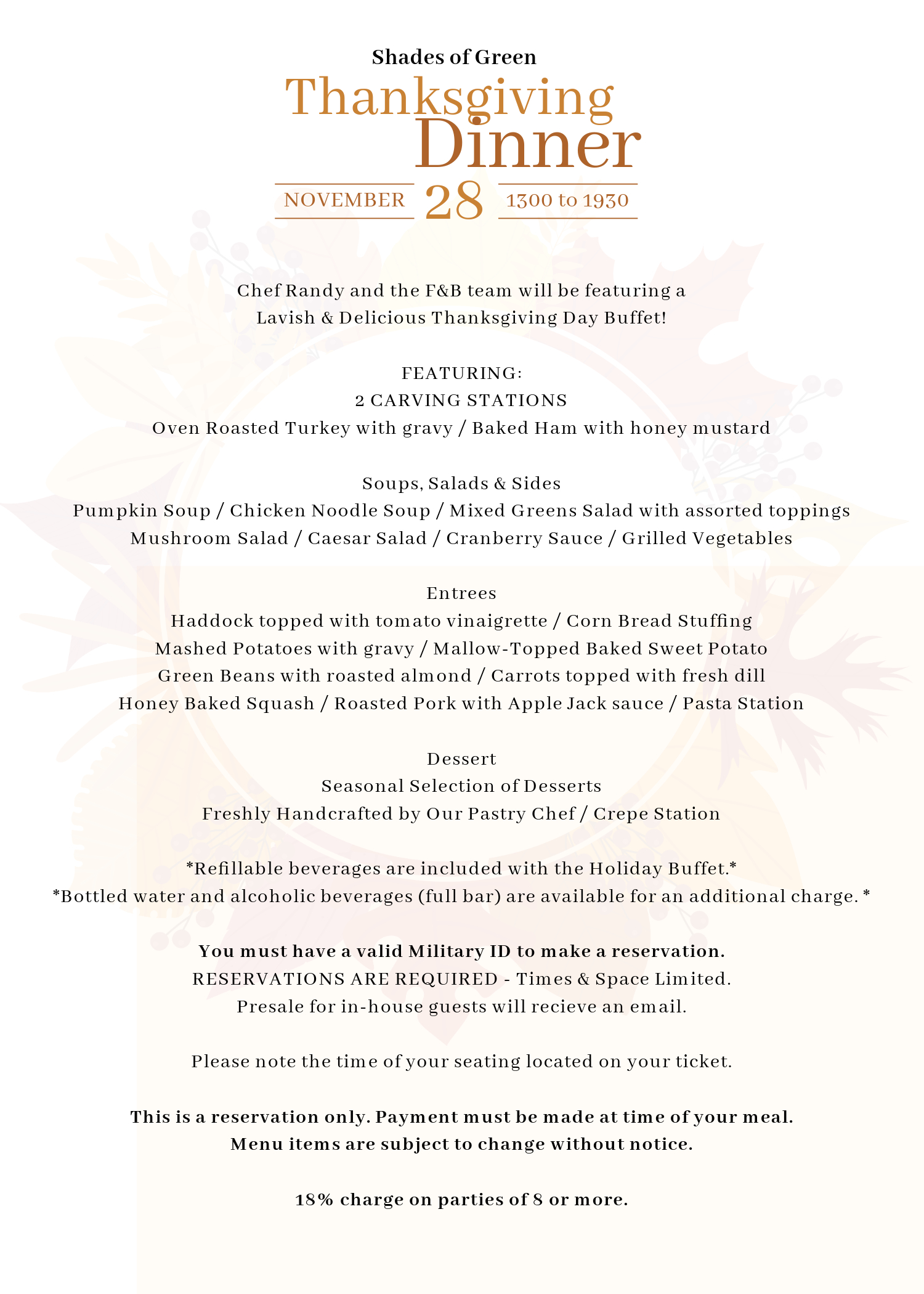 We invite you to relax and indulge in a warm, festive atmosphere, surrounded by fellow military families. Leave the cooking and cleanup to us this year, so you can focus on making cherished memories together.